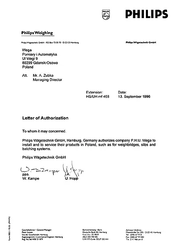 WEGA PROJEKT was established on the basis of P.H.U WEGA, a private company operating since 1990, which was an authorized service provider for Philips branches and specialized in the construction of electronic truck and railway scales.